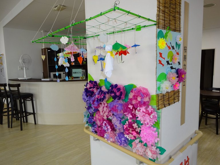 桜寿のさと松田には1F事務所前にエントランスホールがあります。ホールにはご利用者様と職員の共同で創作した作品を展示させて頂いています。上段にてるてる坊主、傘など梅雨をイメージし下段にアジサイの華を飾りました。季節感を感じるとともにご利用者様の知恵と工夫、リハビリを兼ねた作品になりました。