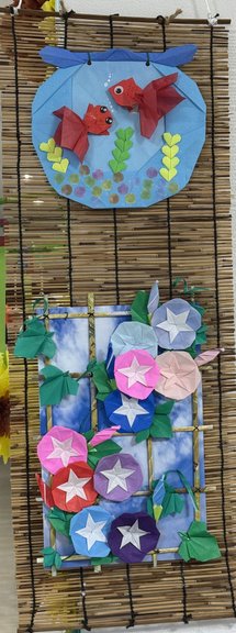 レクリエーションに参加された日には、みんなで作った折り紙を一緒に飾り、