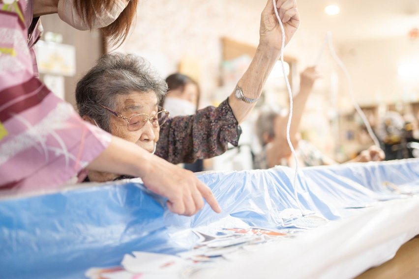 施設内で毎年夏祭りを開催!浴衣&甚平姿のスタッフが、ヨーヨーつりコーナーを設置しました😊