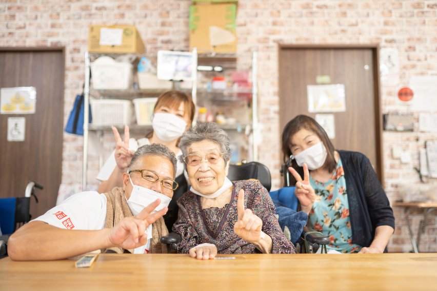 施設内でリハビリも楽しく!ピースサインで集合写真をパチリ📷