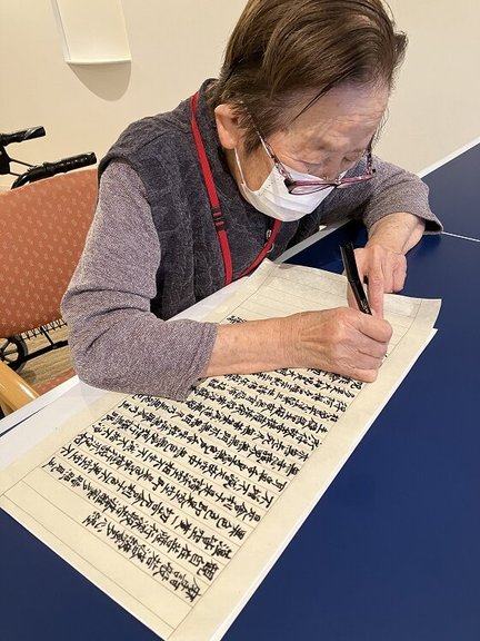 午前は体操を行い、午後からは皆さんが興味のあることをスタッフと一緒に行います。今日は、午前中に30分体操をし、午後は写経です。