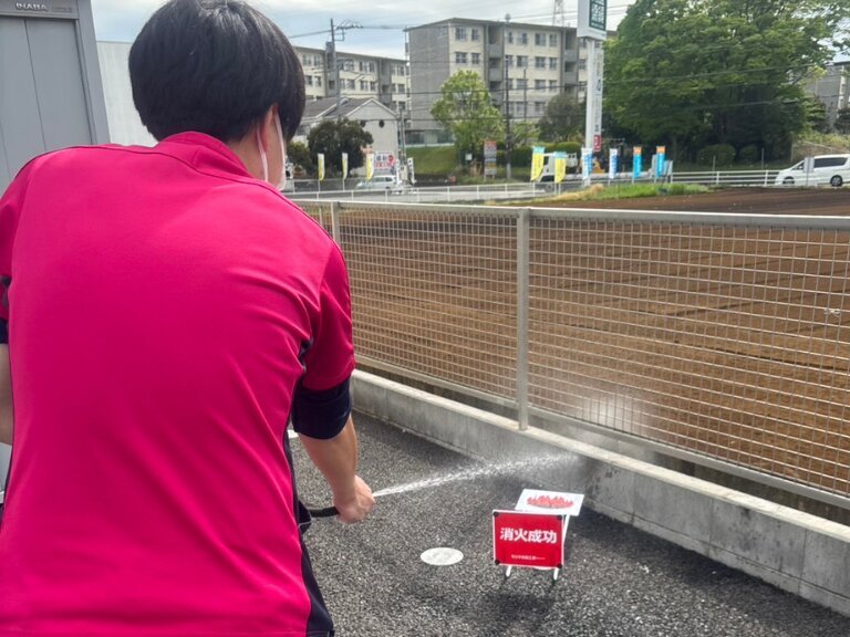 今回の訓練では、実際に水が入った訓練用消火器を使用して、スタッフが一人ずつ消火器の使い方を体験しました😊