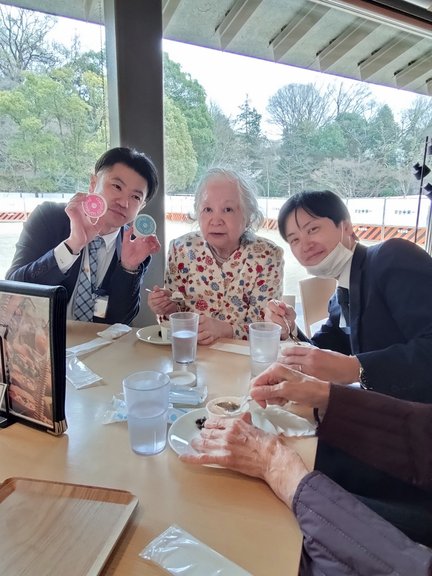 桜の開花には少し早かったのですが、ホームの近くの多摩川河川敷と、さくら坂をドライブし、その後はせせらぎ公園内のカフェでアイスクリームを召し上がっていただきました。