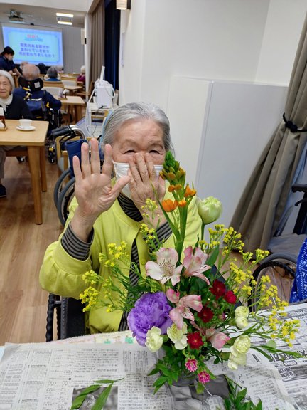 写真のH様は、ホーム内に飾っているお花に水をあげたり、枯れた花を取ったりとメンテナンスまでしてくださっているんですよ!
