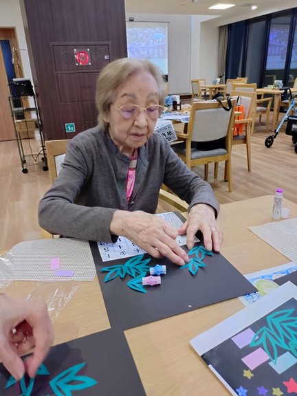 折り紙で作った笹や、天の川、短冊などをバランスよく貼り付けて、皆様個性豊かな素敵な作品が出来上がりました。