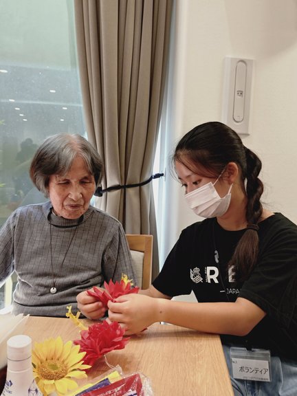 午前中は皆様と一緒に体操をしたり、お部屋の掃除をしたり、午後はアクティビティとしてハイビスカス作りを手伝ってくれたりしました🌺