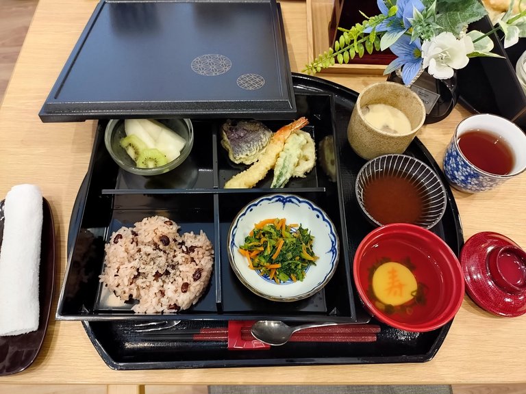 お祝いの定番であるお赤飯に、天ぷらや茶碗蒸し、寿の文字のはんぺんが入ったお吸い物など・・・