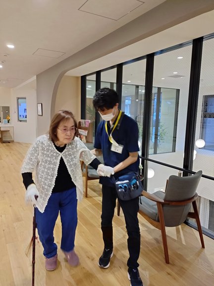 こちらは、普段は車椅子で生活しているM様が「部屋で自由に歩けるようになりたい!!」というご希望を叶えるために、理学療法士と一緒に歩行訓練をしている時の写真です。