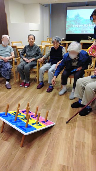 色とりどりの輪っかを数字の棒をめがけて「エイッ」と♪