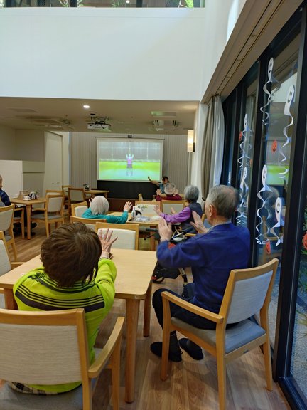 業務用カラオケ「JOYSOUND」の介護施設向けプログラムを利用して、演歌に合わせて体操したりとご高齢者向けな内容で飽きずに楽しくご参加いただいています。