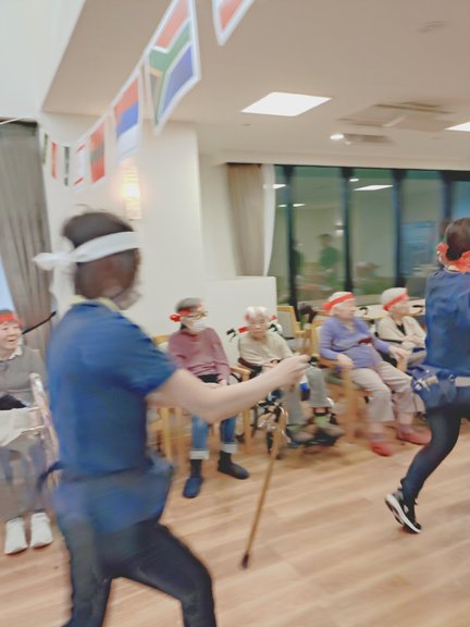 【ぐるぐるバット】は、杖を支えにその場で10回まわった後から走り出す競技で、スタッフ6名でリレー形式で競いました。10回まわった後でも、スムーズに走れるスタッフもいれば、ふらふら走るスタッフもいて、お客様もスタッフの姿を見なが楽しまれていました☺