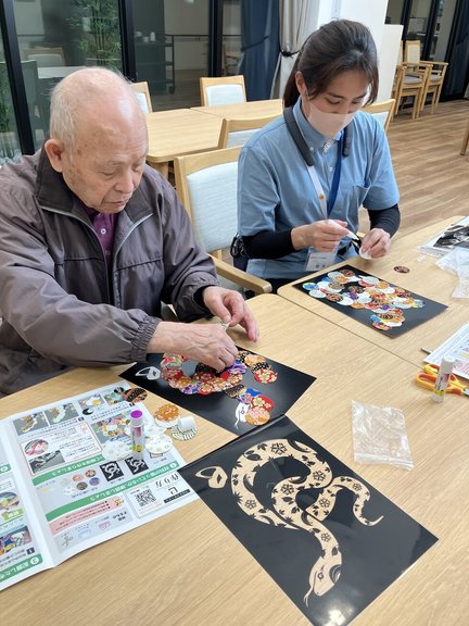 本日の午後のレクリエーションは、蛇の貼り絵を行いました。