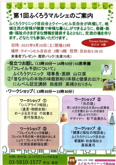 体験」(文京区高齢福祉課)、「健康と福祉の相談会」(ふくろうクリニック目白台)など盛りだくさんです。