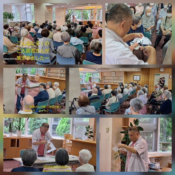 約50人のご入居者が「琴似寄席」を楽しんでいただきました。実は一琴師匠の奥様のお母さまがヴェラス琴似施設に入居されているご縁から開催となりました。初めのごあいさつで「初めまして落語家の柳家一琴と申します。東京からやって参りました。私の師匠は、人間国宝の柳家小三治です。本当は着物を着て座って落語をやればいいんですが、私は着物を着て落語をやるとギャラを取るんですよ。今日はお金はいらないという事で私の予備で「紙切り」をご覧頂きます。」と、まずは挨拶がてら、ご入居者の笑いを取っていらっしゃいました。