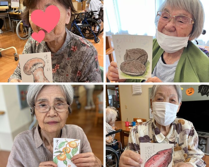 先日、芋掘りを終えたばかりですので、絵手紙の準備をする職員達の頭の中は「秋といえば美味しい食べ物❤️」「食欲の秋!」