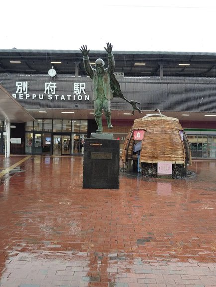 JR別府駅の東出口には「別府観光の父」油屋熊八さんの銅像が建てられております。マントには小鬼が掴まっています。観光客の撮影スポットとなっています。