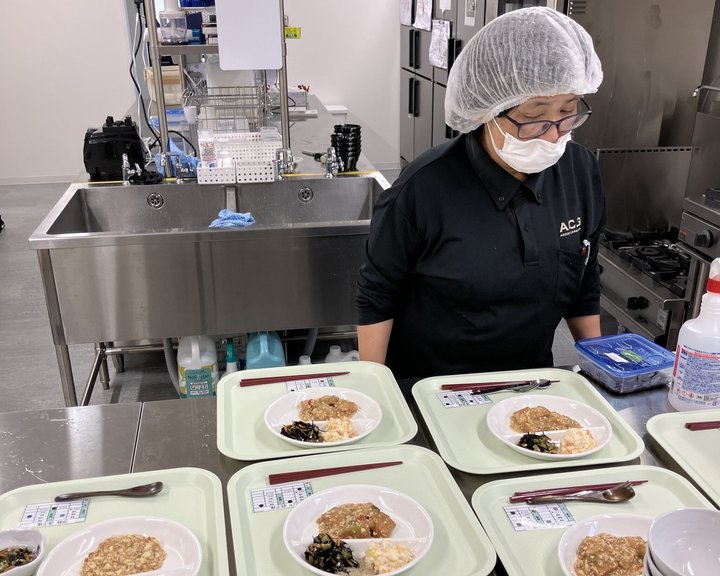 皆様に温かいお食事を召し上がっていただきたく、スタッフは毎日丁寧に準備を進めています。写真は、この日の昼食を盛り付けている様子です。ひとつひとつのプレートに、主菜から副菜までバランスよく、そして彩りよく盛り付けていきます。