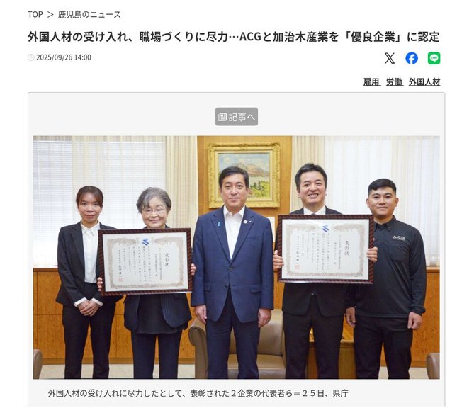 この度、本社を置く鹿児島県より、株式会社ACGが「かごしま外国人材受入優良企業」に認定され、9月25日に鹿児島県庁で表彰を受けました。これは、外国人材の受け入れ体制向上と働きやすい職場づくりに積極的に取り組み、それが高く評価された証です。