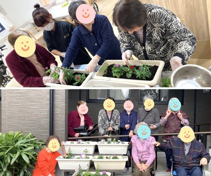 昨日、入居者の皆さんと一緒にプランターへ花の植え付けを行いました!