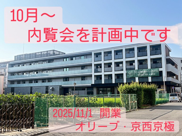 皆様、初めまして。2025年11月1日に、京都市西京区に開設予定のオリーブ・京西京極と申します。これから開設まで、施設内の様子はもちろんの事、様々なイベント等をお伝えできればと思います。また、パンフレットのご準備も出来ておりますので、お気軽にお問い合わせくださいませ。