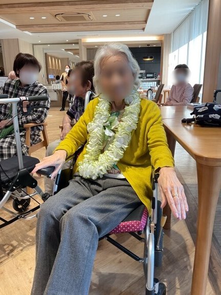 フラダンス経験者の入居者様は、ご自身のレイ(お花の首飾り)をご実家からお持ちいただき、身に着けてくださりました。