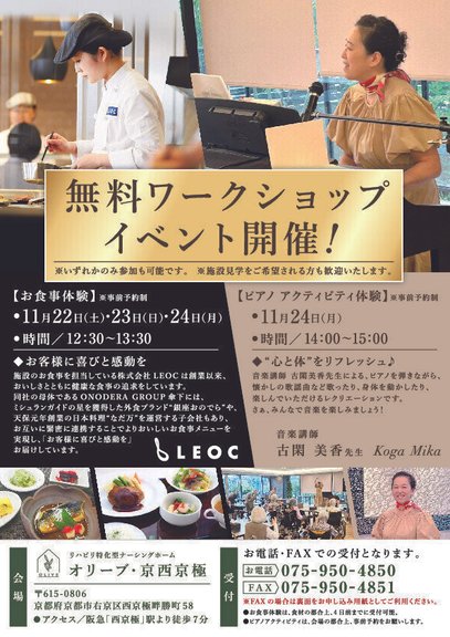 当日は、ご入居者の皆様に実際にご提供をさせて頂いているお食事をご提供し、その後は「認知症」にも精通している美香先生のピアノWorkshopにも参加も可能です。詳しくは、施設までお問い合わせください。