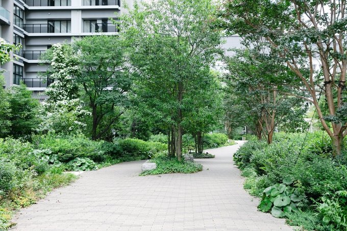 海だけでなく緑にも恵まれているのがこのエリアの特徴。中でも人気なのは、建物の前に広がる中庭で、噴水と四季折々の花や緑が目を楽しませてくれます。