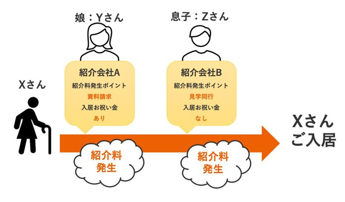実質、B社の見学同行から入居に至ったことから、施設はB社に紹介料を支払うことになります。しかし、A社にはお祝い金の制度があり、Yさんがお祝い金に誘導され、A社経由での入居を申告したため(あるいはA社の事後確認でXさんが当該施設への入居が確認できたため)、A社からも施設側に紹介料の請求が来る。そうしたケースが報告されています。