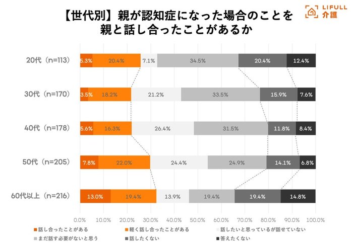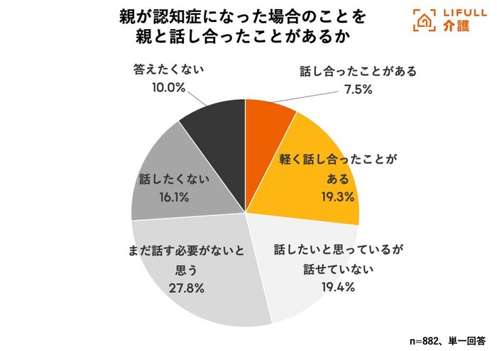 親が認知症になった場合のことを親と話し合ったことがあるかを聞いたところ、「話し合ったことがある」(7.5%)、「軽く話し合ったことがある」(19.3%)を合計し、26.8%とおよそ3割が話し合ったことがあると回答しており、話し合ったことがない人は7割にも上ることがわかりました。