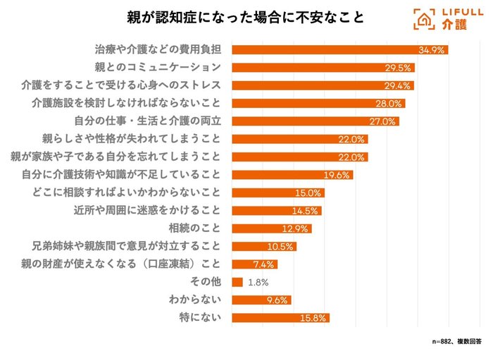 親が認知症になった場合に不安なことについて聞いたところ「治療や介護などの費用負担」(34.9%)が最も多い結果になりました。治療内容や必要な介護は人によって大きく差があり、一般的な相場がわかりづらいものです。経験がない方にとってはより不透明な部分が多く、不安に感じる人が多いようです。