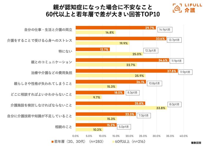 「親が認知症になった場合に不安なこと」の世代間ギャップを見るために、60代以上と若年層(20~30代)を比較し、ギャップが大きかった項目トップ10を出してみました。最もギャップが大きかったのは「自分の仕事・生活と介護の両立」で、若年層が60代以上よりも不安視していることがわかりました。20〜30代は働く現役世代ということもあり、仕事と介護の両立をより不安視する傾向にあると言えそうです。他に若年層の方が不安視している項目として「介護をすることで受ける心身へのストレス」、「親とのコミュニケーション」などがありました。