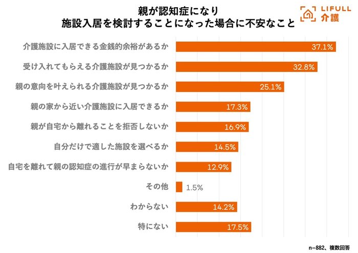 親が認知症になり、もしも施設入居を検討することになった場合に不安なことを聞いたところ、最も多かったのは「介護施設に入居できる金銭的余裕があるか」(37.1%)でした。介護の経験がない方にとってお金は最も不安なこととして挙げられるようです。