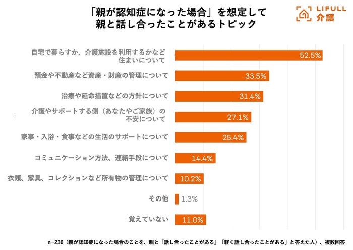 親と、「親が認知症になった場合」について「話し合ったことがある」、「軽く話し合ったことがある」と回答した方にどんなトピックについて話し合ったことがあるか聞いたところ、およそ半数の方が「自宅で暮らすか、介護施設を利用するかなど住まいについて」と回答しており、認知症と住まいの場所の問題が結びついている方が多いことがわかります。