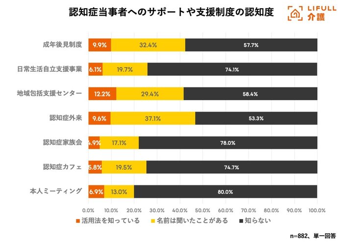 認知症当事者へのサポートや支援制度の名前を挙げ、どれだけ知っているか聞いてみたところ、全ての項目で「知らない」が過半数を超えることがわかりました。特に「本人ミーティング」、「認知症カフェ」、「認知症家族会」など、公的な制度ではないものの当事者やご家族同士で交流できる仕組みが、いずれも「知らない」が7割を超えており、知名度の低さが浮かび上がりました。
